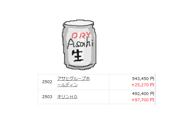 乳酸菌つながりでアサヒ(傘下にカルピス)も見つけて、サイバー攻撃で下がった時に、応援で買いました。